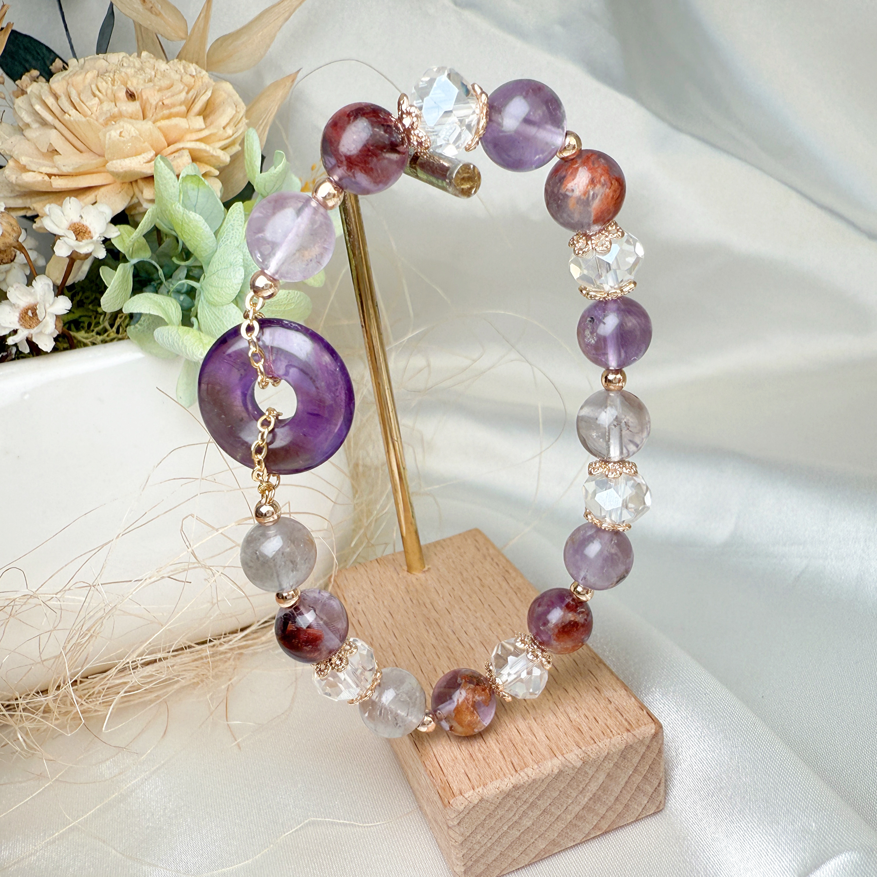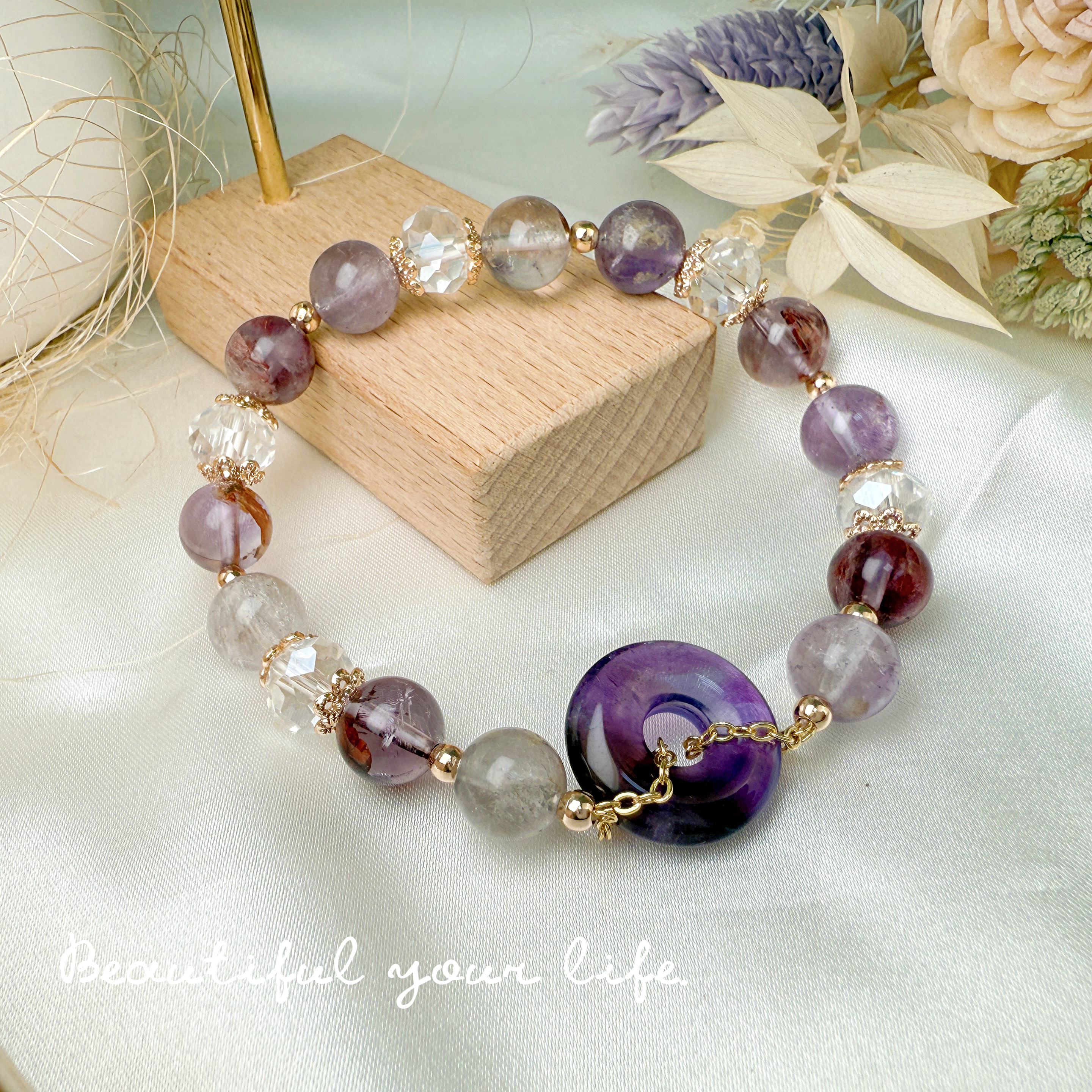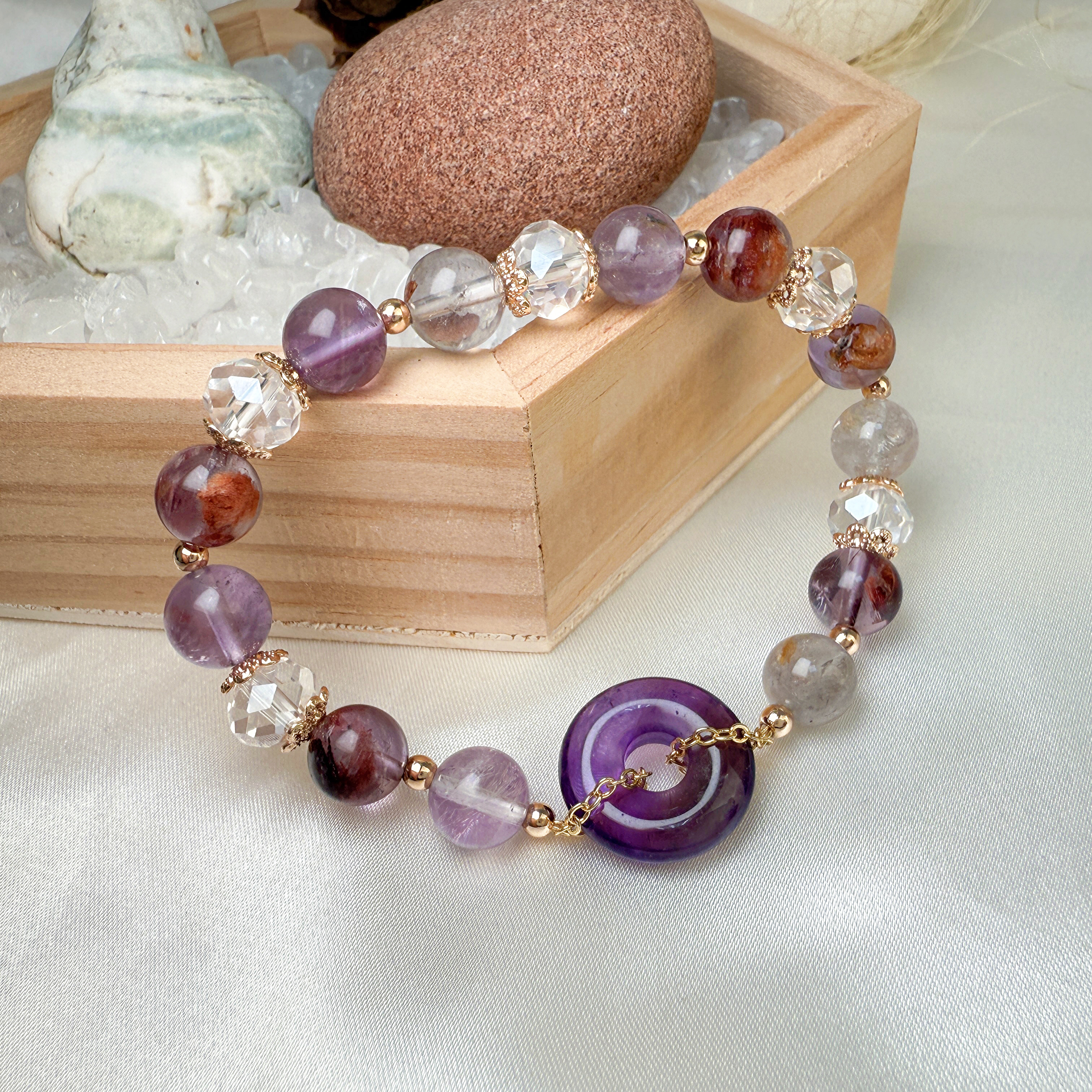 以紫幽靈的靈性智慧、紫水晶的智慧啟發,放大心緒能量,組合成兼具守護與提升貴人運的能量手鍊。