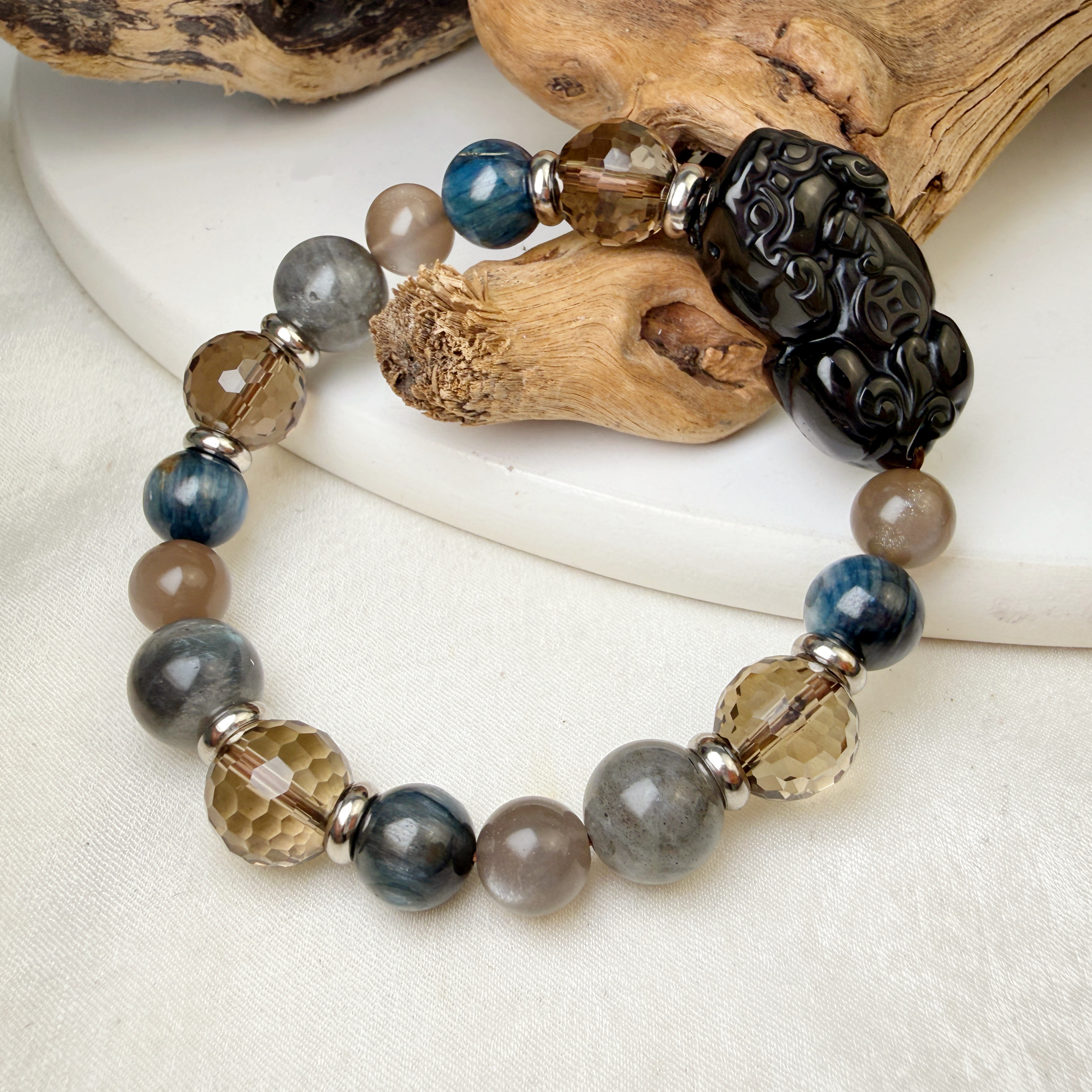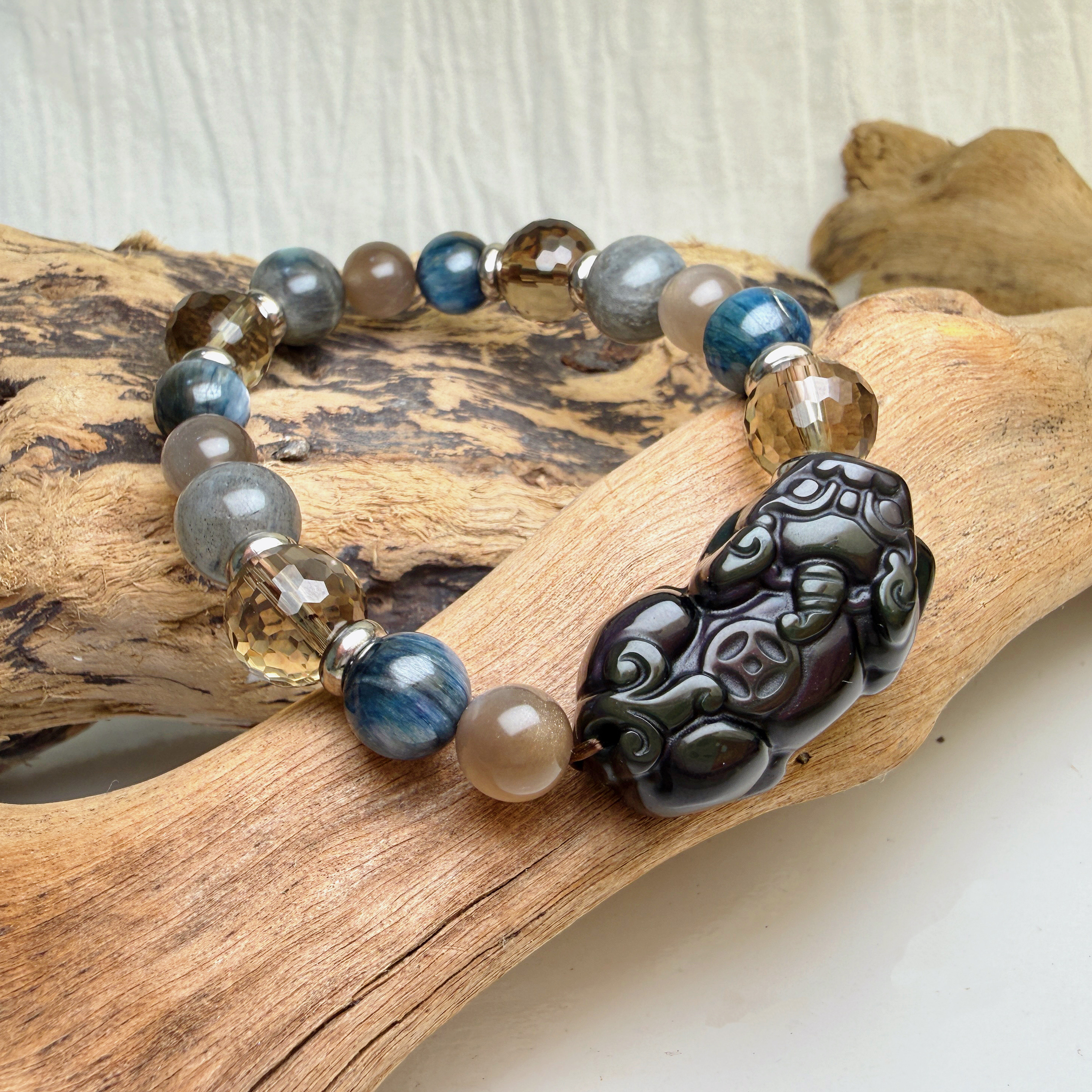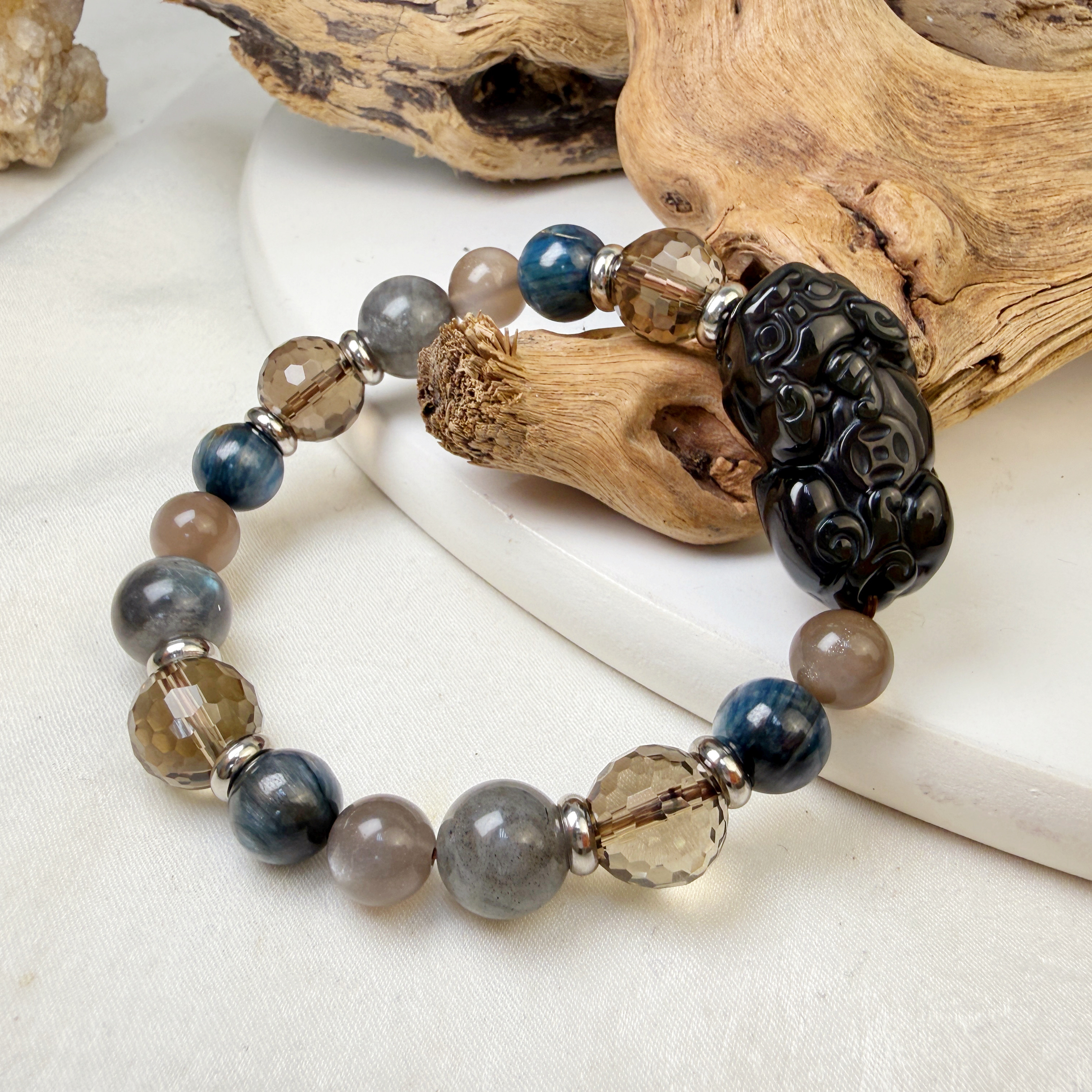 招財擋煞/水晶能量-《彩虹黑曜貔貅月亮系藍晶手鍊》