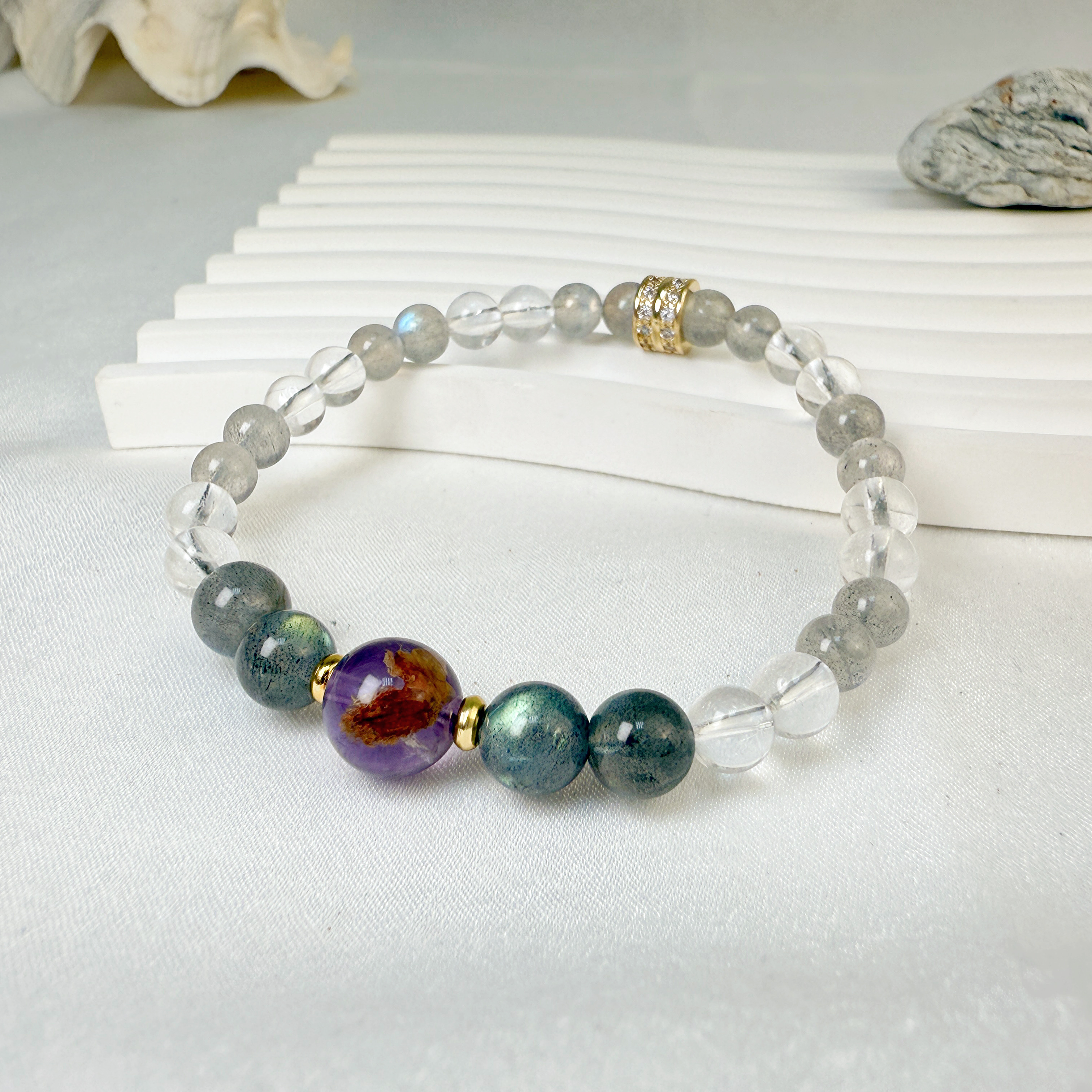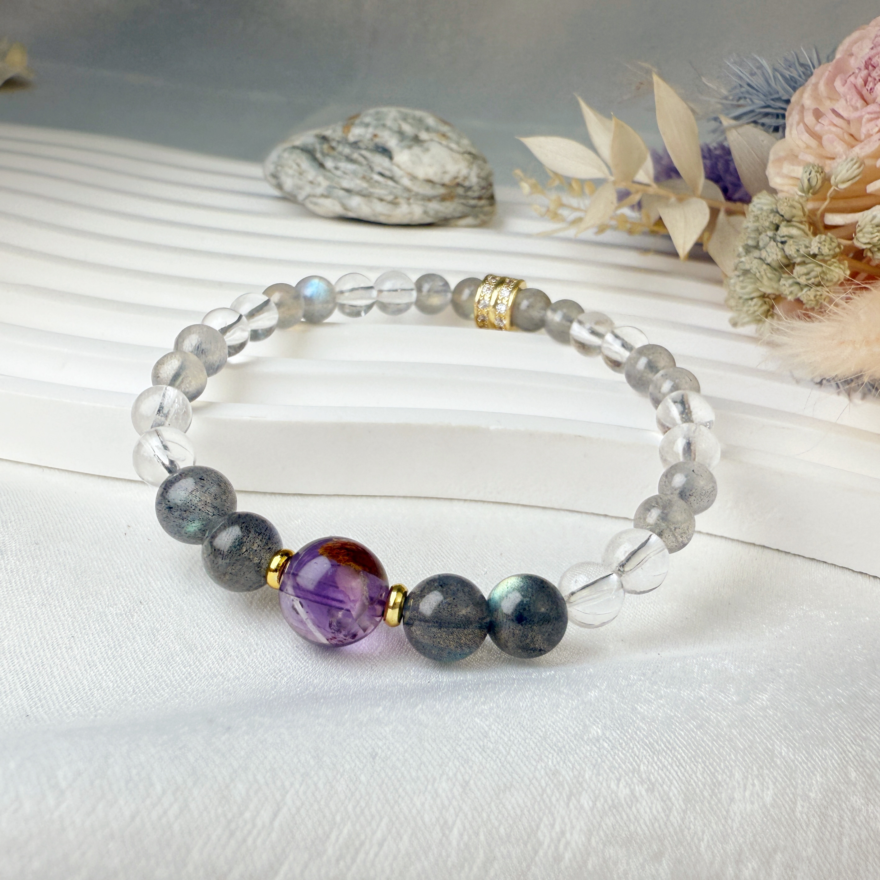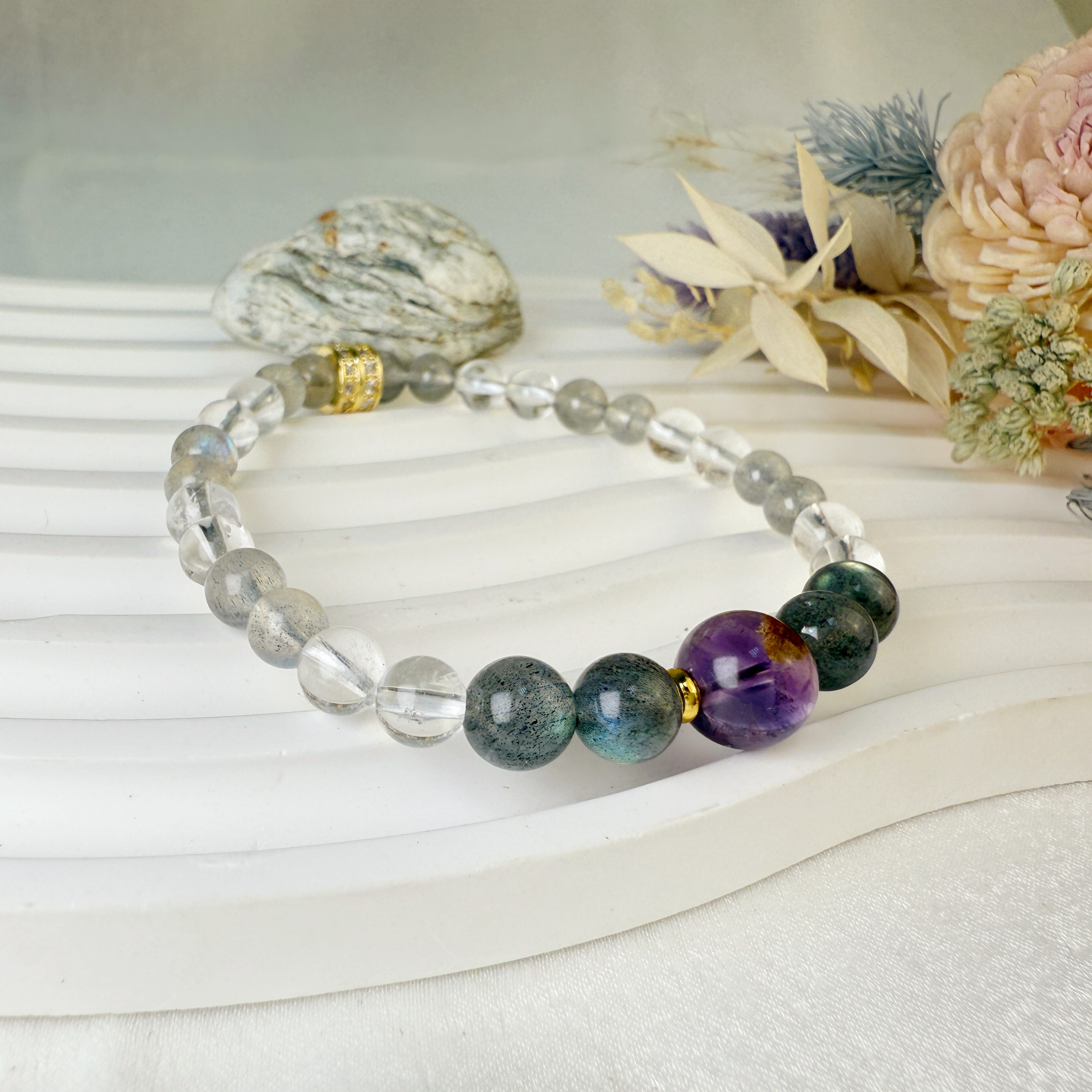 以紫幽靈的靈性智慧、拉長石的直覺啟發,加上白水晶的淨化放大能量,組合成兼具守護與提升的能量手鍊。
