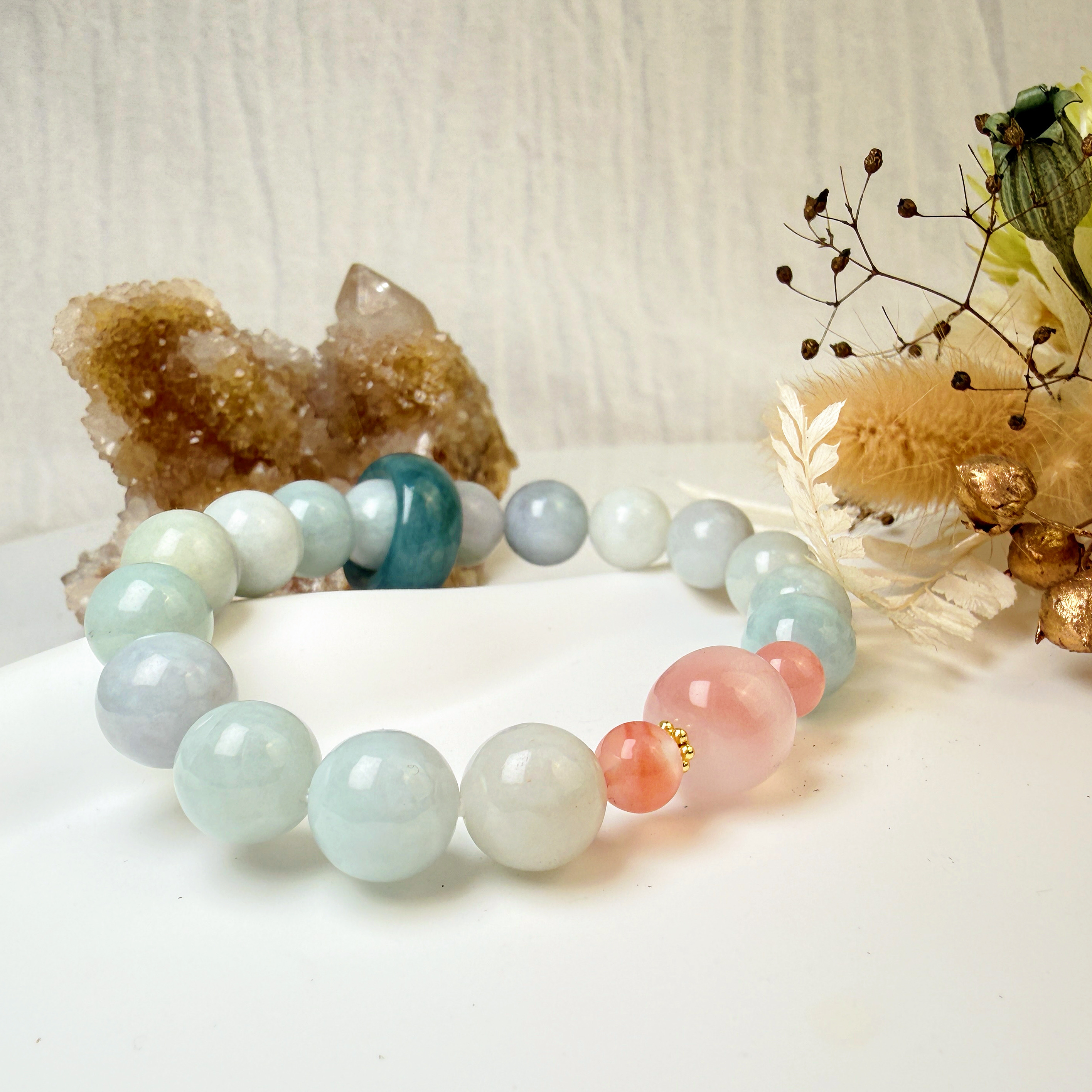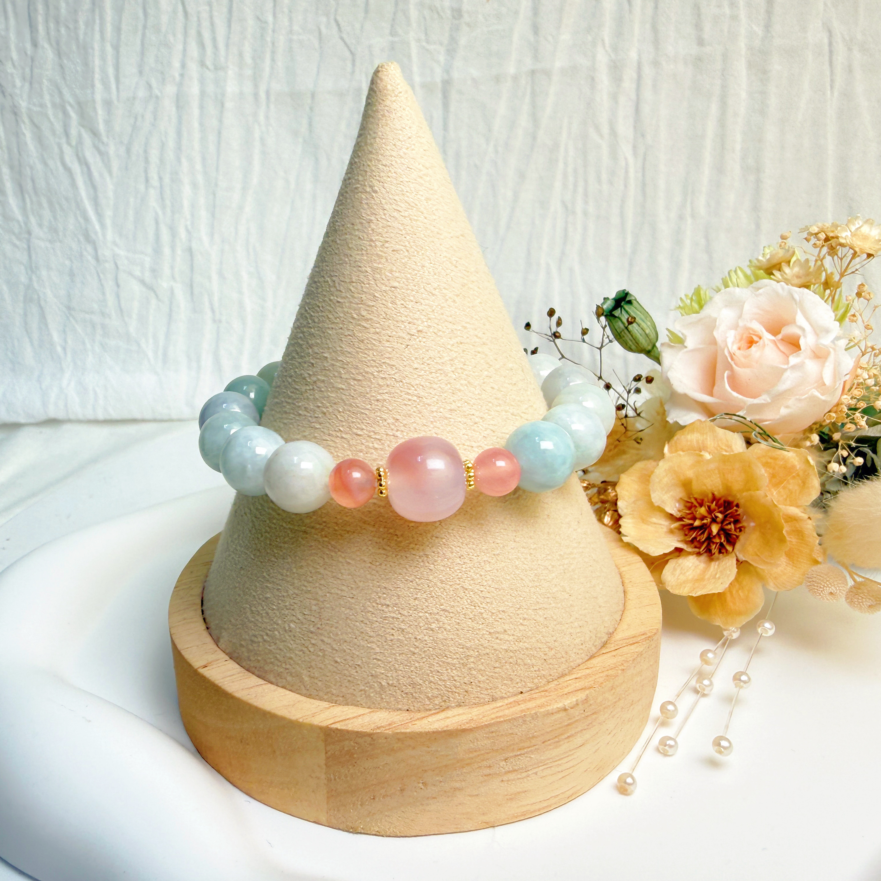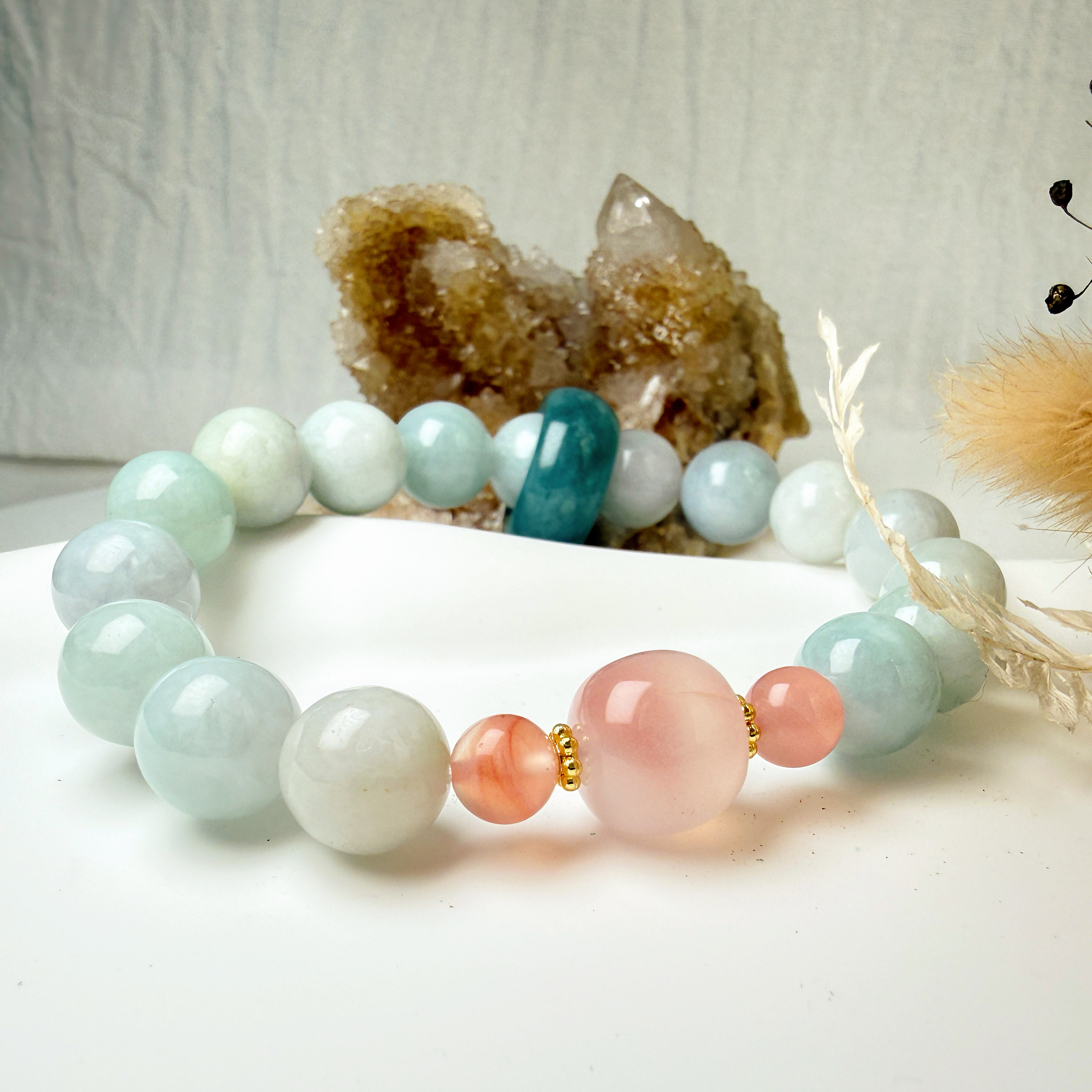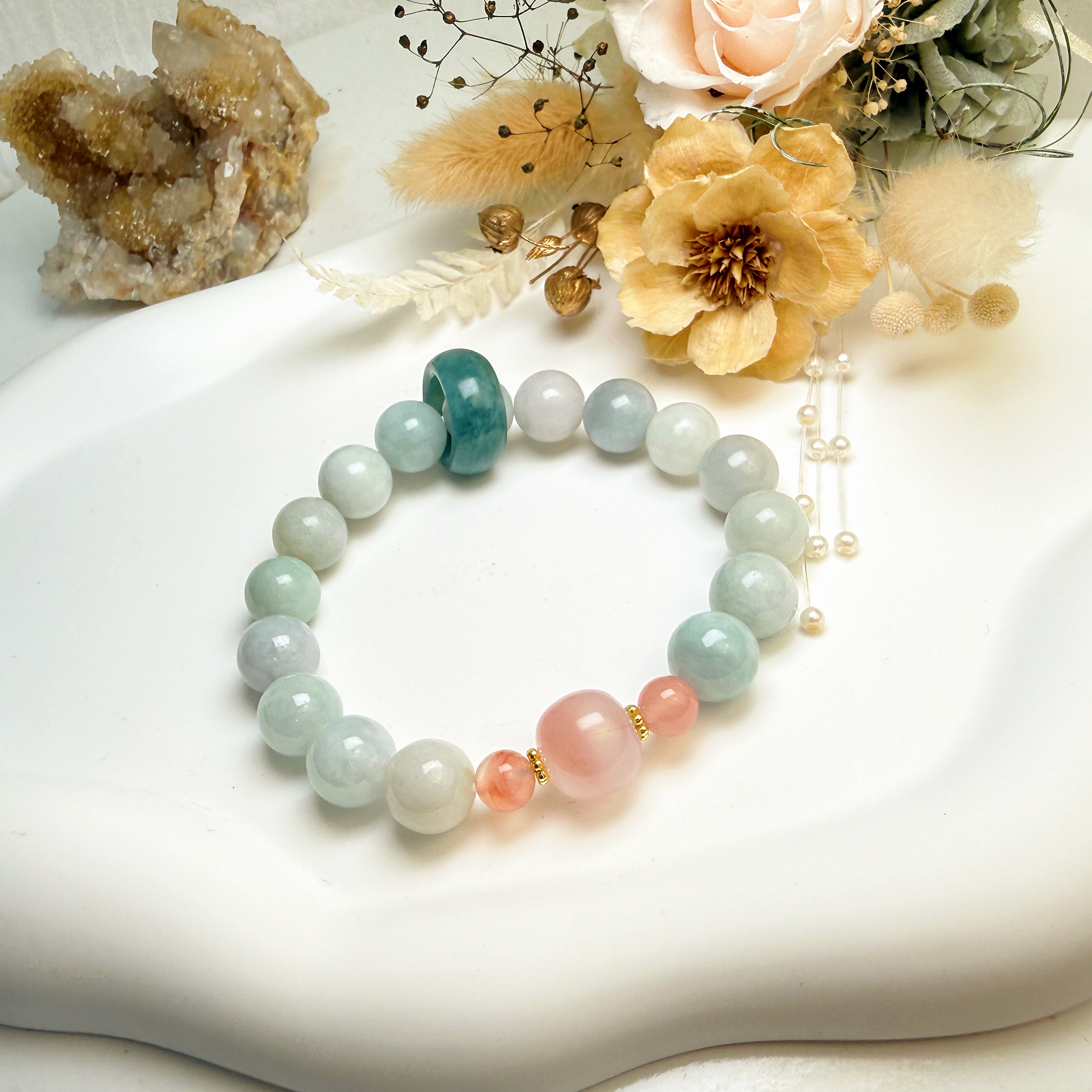 以清新柔和的豆青色為底,融合南紅的溫暖色澤與自然飄花紋理,彷彿將山水意境凝於腕間。