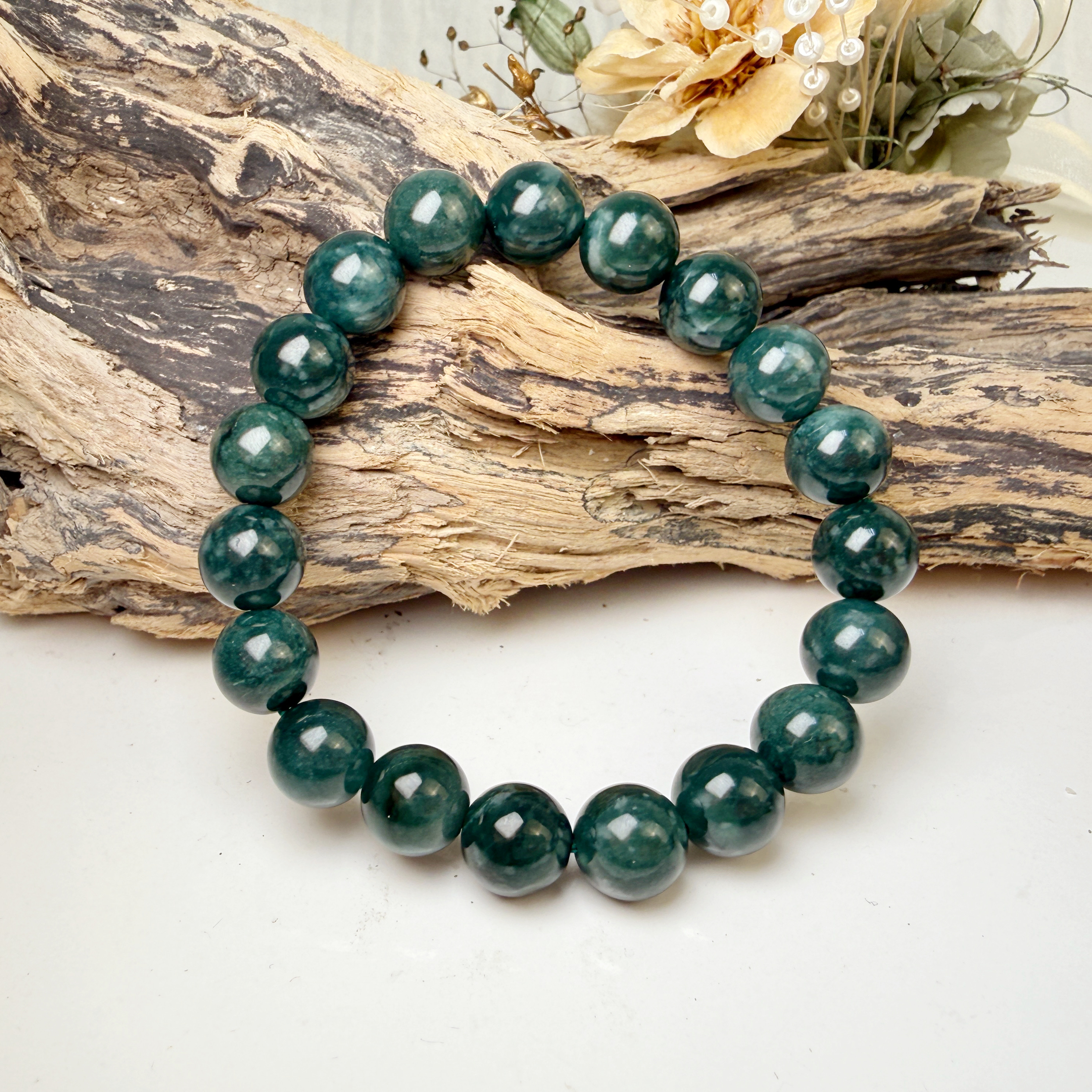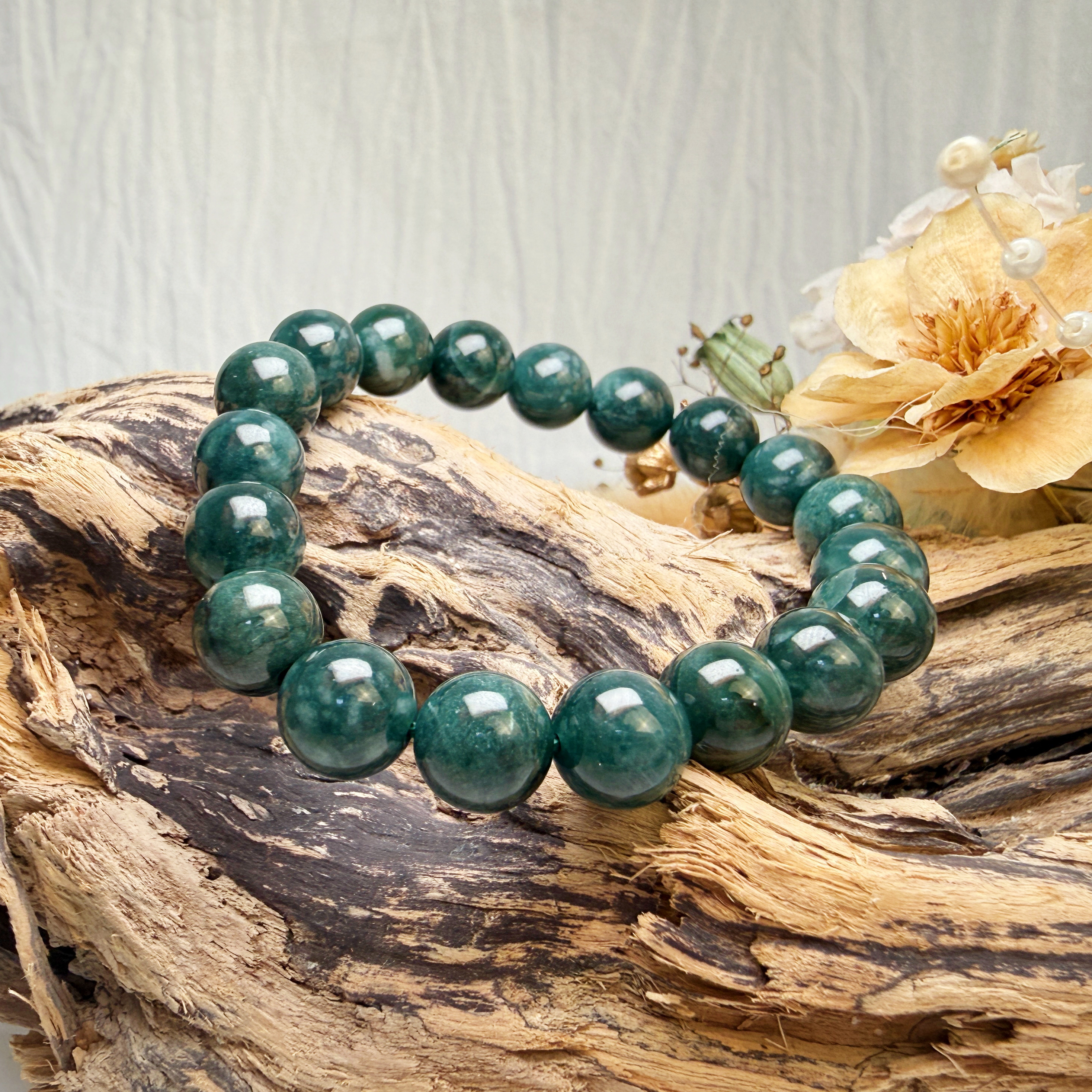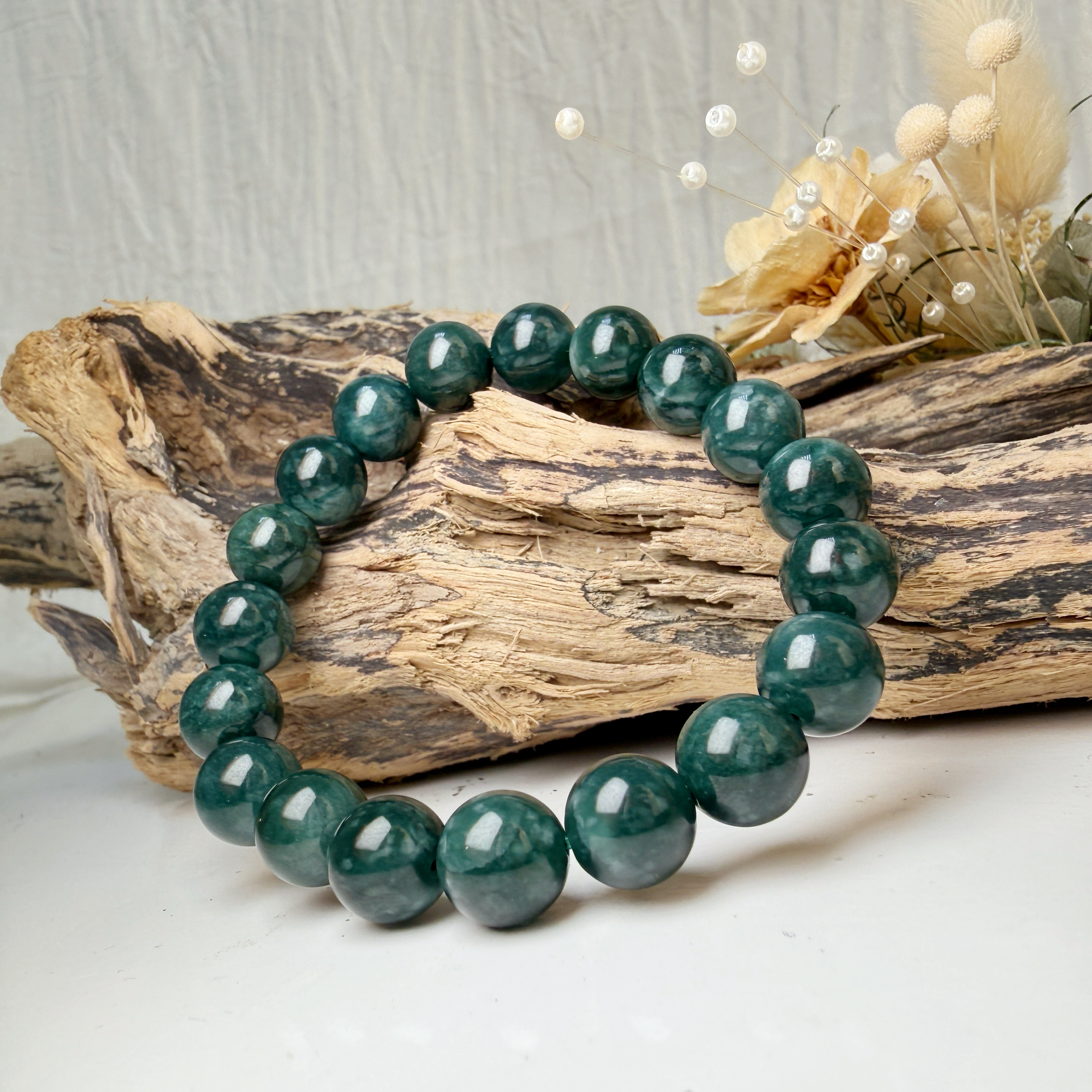 選用質地細膩、色澤沉穩的油青種翡翠,每一顆珠子都蘊含大地孕育的靈性與溫潤光澤。