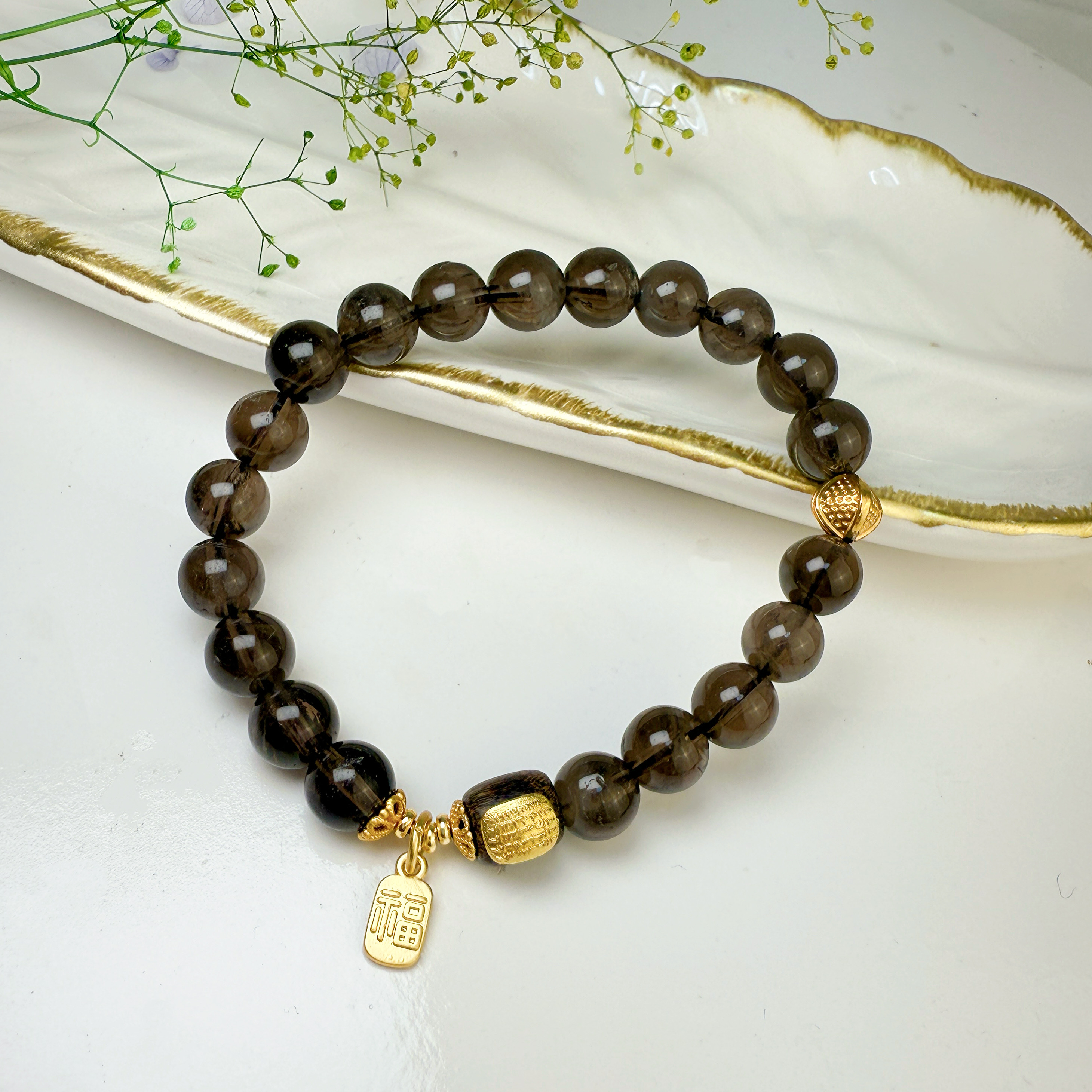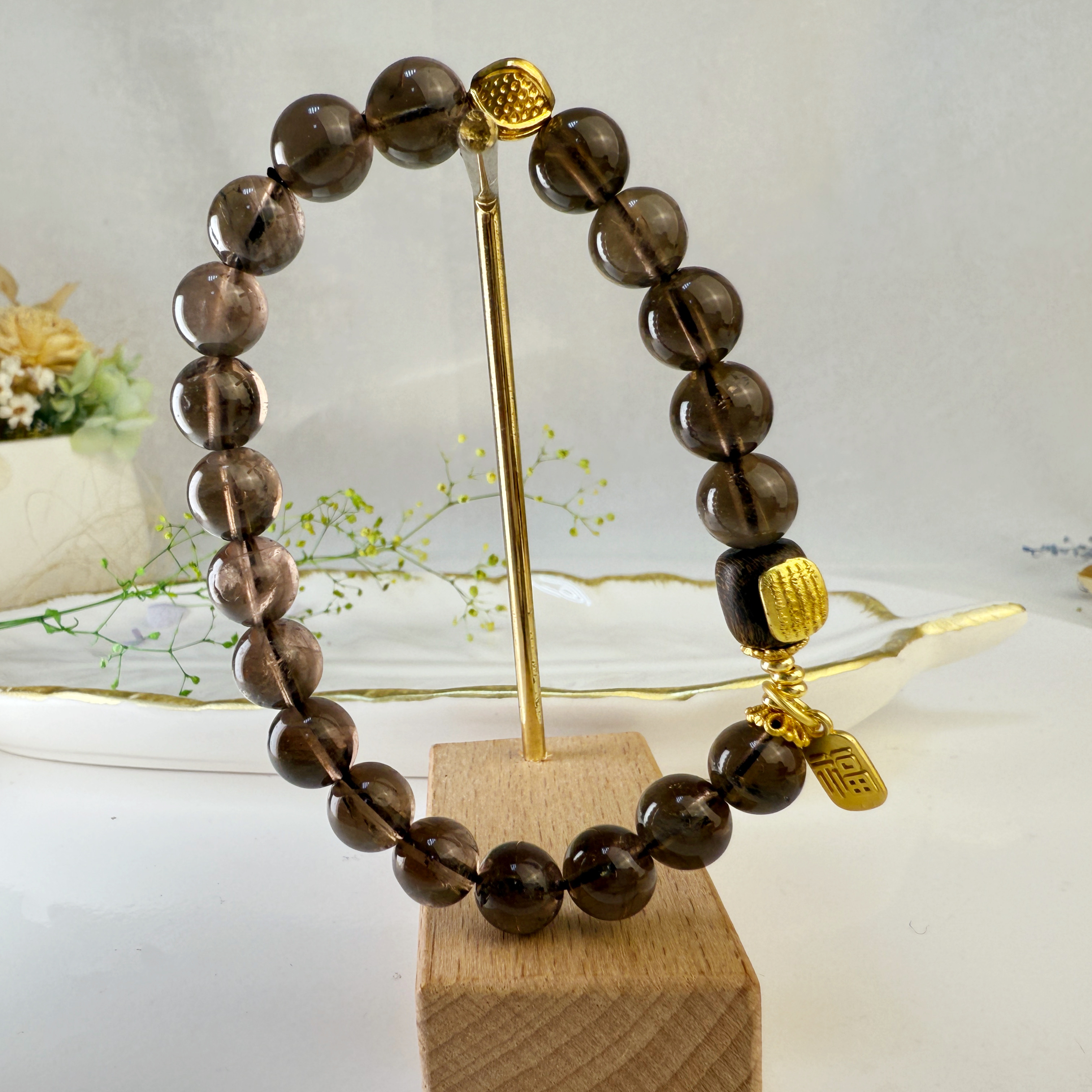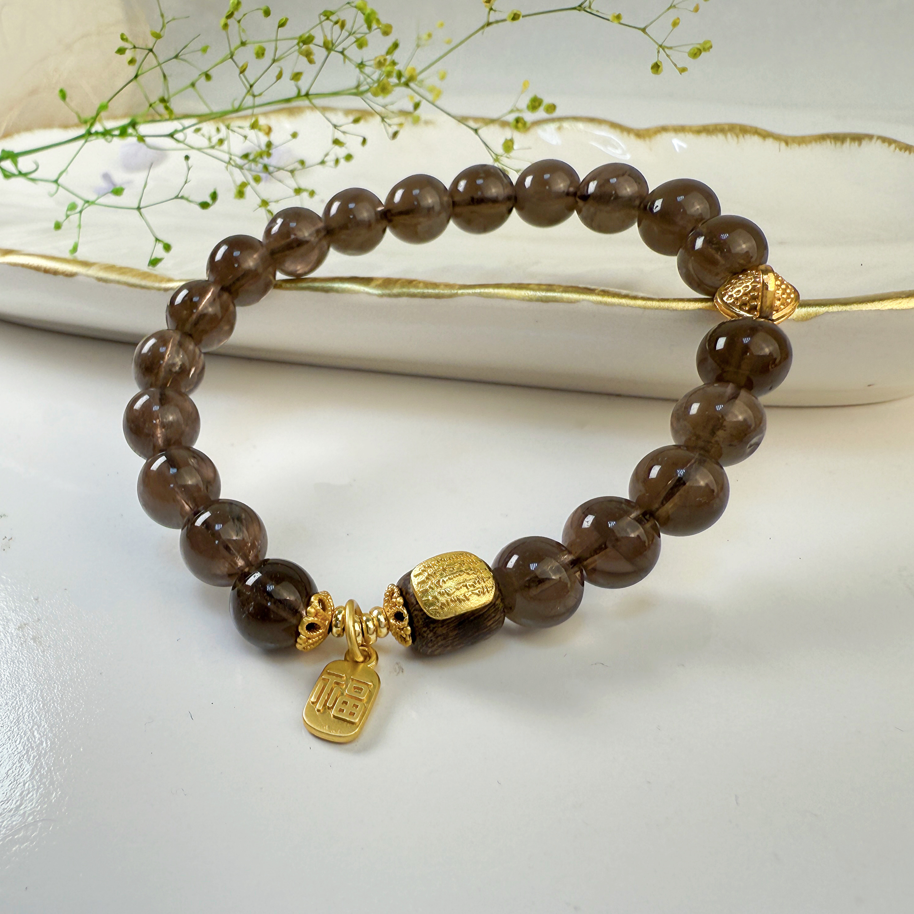 以天然原木鑲上銅片經文,蘊含樸實溫潤的木質能量;搭配淬煉大地之氣的茶晶,沉穩、避煞與聚焦,讓你的每一步都更加踏實。